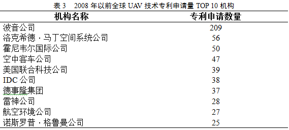 如表1、2,UAV技术专利申请中很大一部分是关于玩具无人机的,该部分技术最大的申请人就是深圳大疆;USPTO申请量最大的申请人除深圳大疆外,还包括航空专家和国防承办商;在USPTO top 10机构中,亚马逊公司值得关注,该公司已经公开宣布要将UAV应用到送货服务当中;高智发明公司作为领先的专利申请人颇受争议。