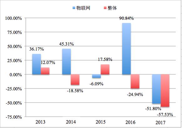图2 物联网及整体专利诉讼量年增长率(2013-2017)
