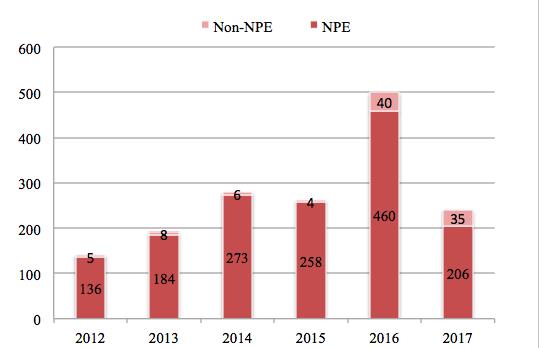 如图1所示,尽管2017年物联网专利诉讼量降低,但NPEs提起的诉讼仍占物联网诉讼量的86%。