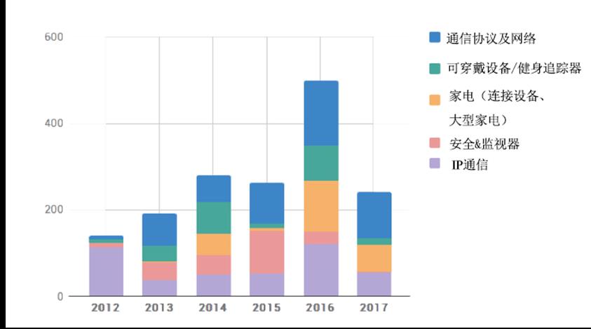 2016至2017年间,通信协议及网络类别的专利诉讼量占比上升了10%,而其他物联网技术的比例变化不大(图3)。