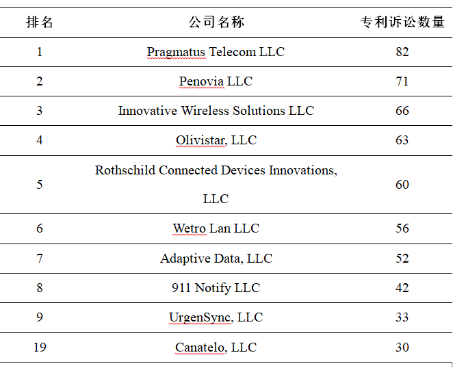 表1 物联网专利诉讼NPE前十位(2012-2017)