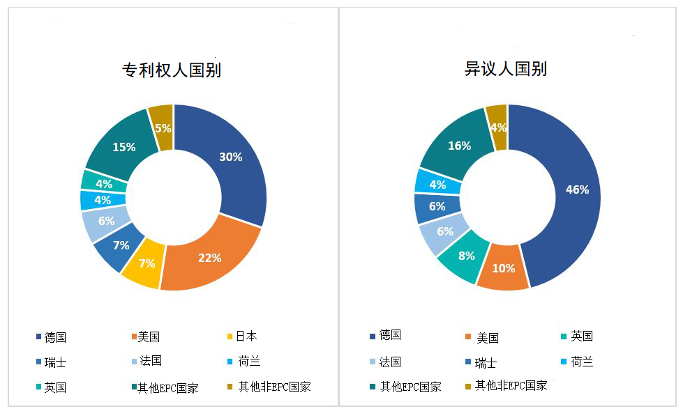 2015到2016年间,EPO专利异议的专利权人和异议人的国别构成基本相同。如图1所示,2016年发起的专利异议申请中,德国专利权人占30%,德国异议人占46%。