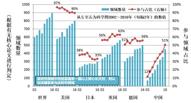 日本:研究领域参与数量2016年比2014年增加了9.1%(25个领域),参与比例从2014年的32%增长到了2016年的33%;