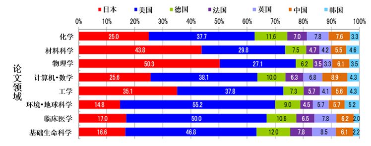 日本物理学和材料科学的论文大约一半都由日本专利引用;另外,日本环境/地球科学、临床医学、基础生命科学相关论文大约一半由美国专利引用。