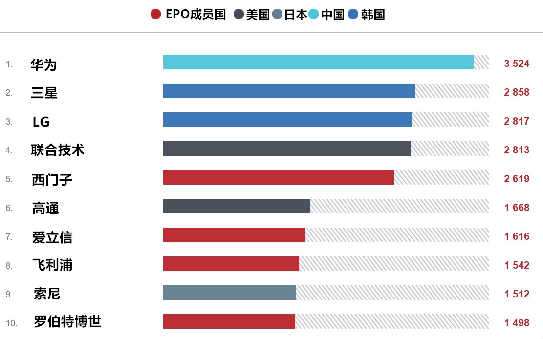 2020年3月12日,欧洲专利局(EPO)发布了《2019年专利指数》(Patent Index 2019)报告,报告指出,欧洲专利申请量持续增长,创历史新高,其中华为的申请量位居榜首。