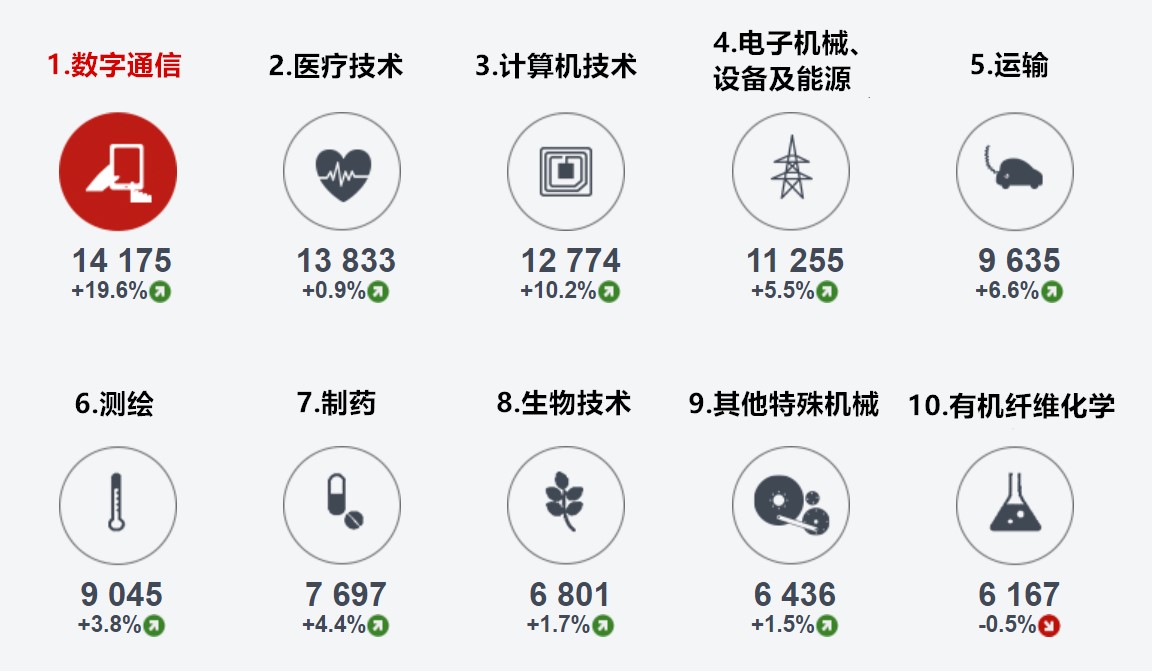 图3显示了欧洲专利申请的热门领域。迄今为止,数字通信技术的专利申请量增长最为强劲,年申请量十多年来首次超过了医疗技术,这反映了5G技术的发展方向。在人工智能崛起的推动下,计算机技术成为增长速度排名第二领域。2019年,排名前十位的技术领域占EPO申请总量的54%。