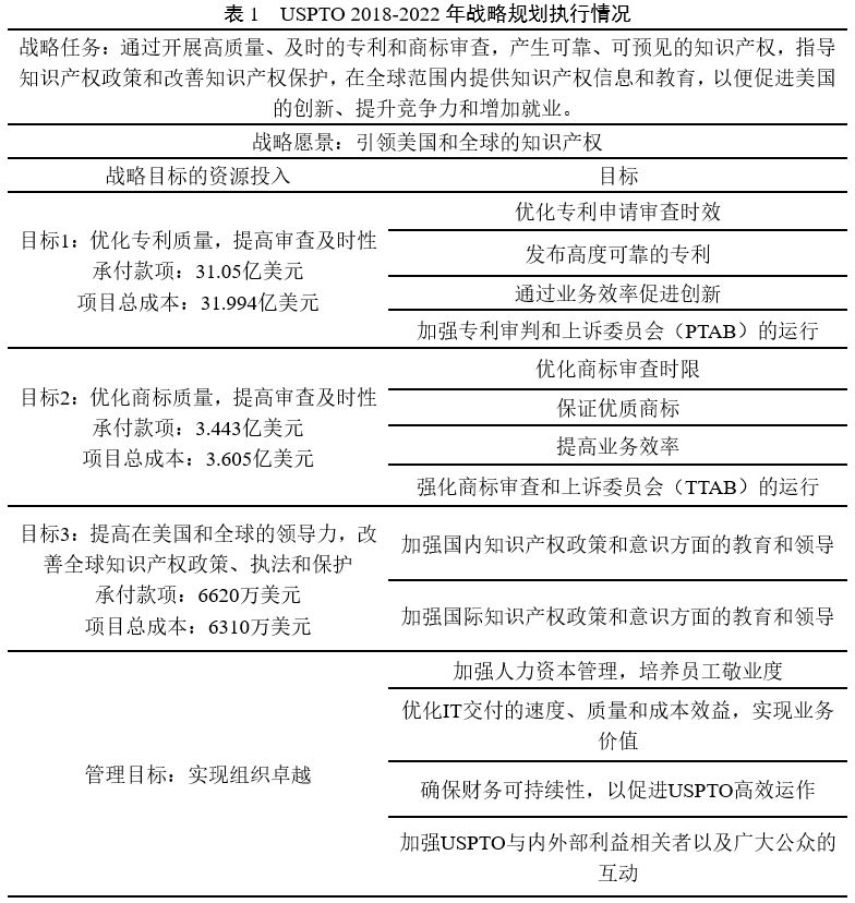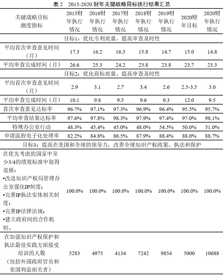 在未来几年中,USPTO将继续朝着三个战略目标和一个相关任务的管理目标努力,这四个主要目标也与美国商务部“加强知识产权保护”的战略目标相一致。表2汇总了2015-2020财年关键战略目标执行情况。