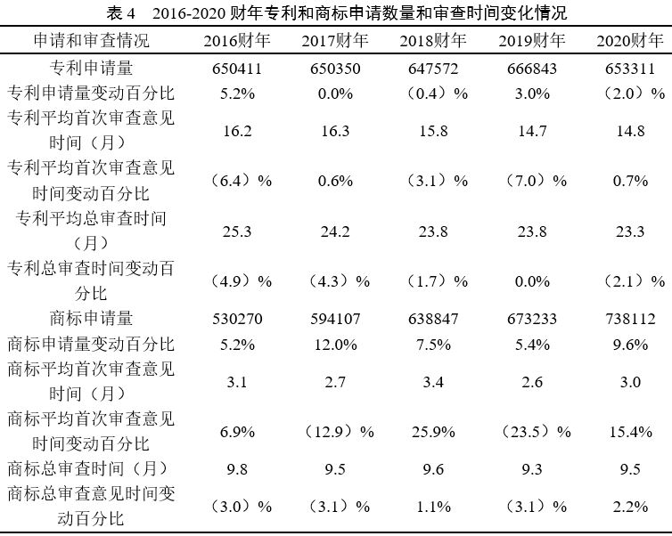 商标审查以优化商标质量和时效性为战略目标。从2007年开始,首次审查意见通知时间不到3.5个月,商标注册时间平均少于12个月。2020财年,首次审查意见通知时间为3个月,商标平均总审查时间为9.5个月(表3)。