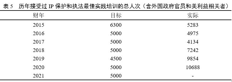 USPTO根据法规授权就国际国内知识产权问题以及相关协议向美国商务部和联邦机构提供指导。通过项目和研究,与全球知识产权办公室和国际政府间组织就涉及知识产权的事项进行交涉:代表美国在世界知识产权组织(WIPO)进行引领谈判;协助美国贸易代表(USTR)谈判和实施国际贸易协定的知识产权条款;就所有知识产权政策事项向商务部长和行政部门提供咨询意见,包括专利、设计、版权、商标、植物品种保护和商业秘密等领域;对知识产权相关事宜开展实证研究;提供知识产权保护、使用和执行方面的教育计划(表5)。