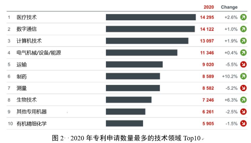 在领先的技术领域中,药品(+10.2%)和生物技术(+6.3%)的专利申请量增幅最大。2020年,医疗技术(+2.6%)是发明数量最多的领域,超过了2019年最活跃的数字通信领域。此前增幅最大的数字通信(包括5G网络支持技术)和计算机技术(包括人工智能相关发明)领域继续呈现强劲的专利活动,分别排名第二和第三,比2019年增长1.0%和1.9%。与此同时,运输领域降幅最大(-5.5%),尤其是子领域:航空和航天(-24.7%);此外,汽车领域降幅较小(-1.6%)。