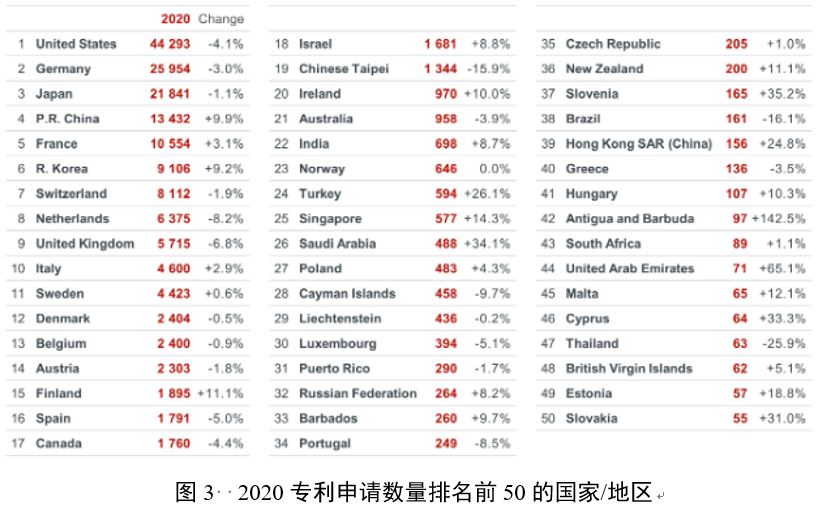 从发明的来源地区来看,2020年排名前五位的国家是美国(44293件)、德国(25954件)、日本(21841件)、中国(13432件)和法国(10554件),但增长率有较大差异:前10名国家中增长最强劲的是中国(+9.9%)和韩国(+9.2%),与2019年保持一致。中国公司在生物技术、电气机械/装置/能源(包括许多清洁能源技术发明)和数字通信申请了更多的专利。韩国公司在电气机械/装置/能源、电信、半导体和计算机技术领域尤为活跃。