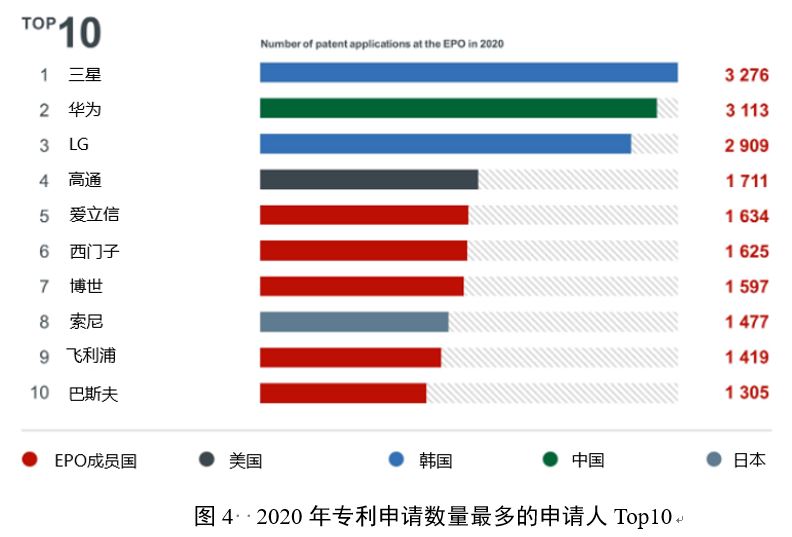 2020年Top10申请人排名,也反映了中国和韩国专利申请的持续增长。三星(3276件)位居榜首,其次是华为(3113件),LG位居第三(2909件)。前十排名中,包括五家欧洲公司(2014年以来数量最多),两家韩国公司以及中国、日本和美国各一家。