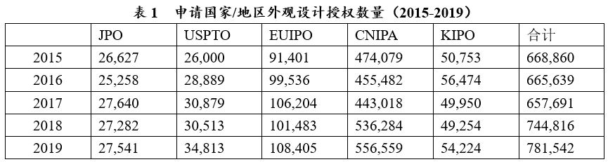 (1)在日本专利局(JPO)、美国专利商标局(USPTO)、欧盟知识产权局(EUIPO)、中国国家知识产权局(CNIPA)和韩国知识产权局(KIPO)获得授权的外观设计数量由2018年的744,816件增加至2019年的781,542件。如表1所示,相对于2018年,各国家/地区的外观设计授权数量都有所增长。