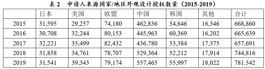(2)2019年,申请人来源国家/地区的外观设计授权数量最多的是中国(557,465件)。相对于2018年,日本人的外观设计授权数量略有减少,其他国家/地区申请人外观设计授权数量均有所增加。