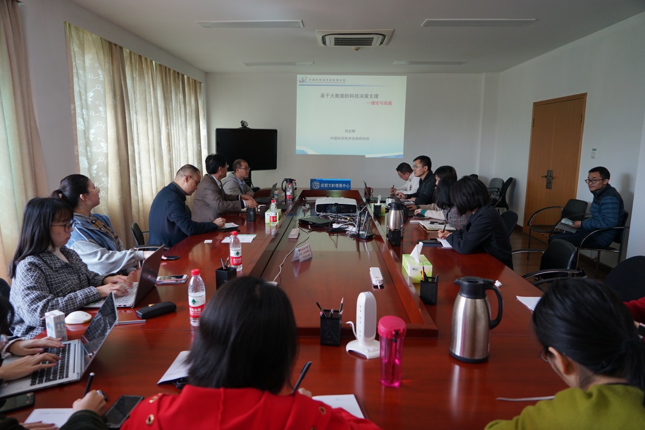 刘志辉作了题为《基于大数据的科技决策支撑理论与实践》的学术报告,介绍了面向科技决策的科技大数据情报分析流程、科技数据分析平台、科技知识图谱等内容。中心各部门业务骨干二十余人听取了报告。