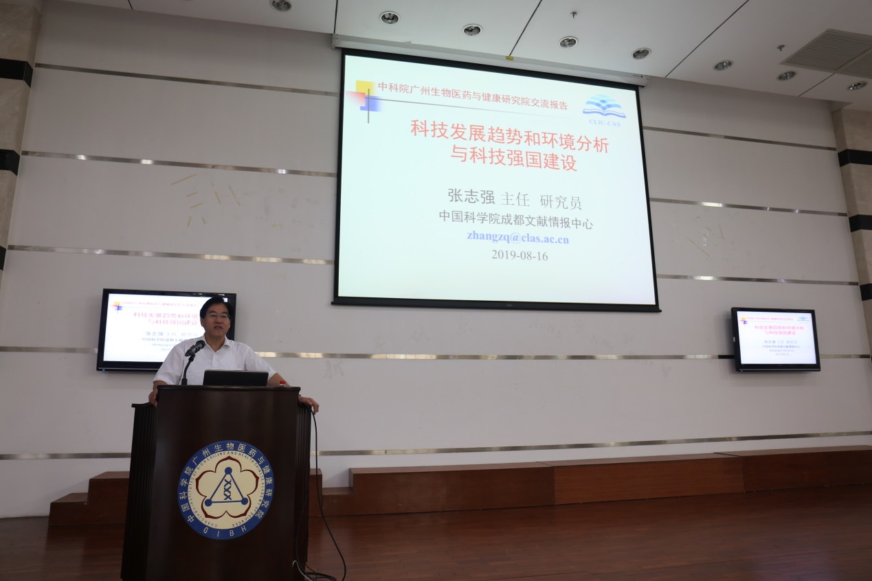 8月16日,中国科学院成都文献情报中心主任张志强研究员应邀为中国科学院广州生物医药与健康研究院作题为《科技发展趋势和环境分析与科技强国建设》的专题报告。中国科学院广州生物医药与健康研究院院长陈新文,副院长李尹雄、潘光锦等院领导及中层干部、科研人员和研究生等200余人参加。报告会由潘光锦主持。