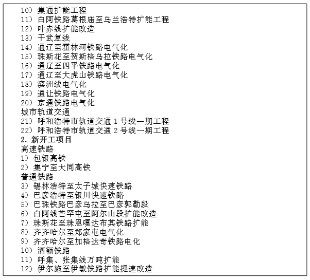 加快建设快速客运铁路。加快出区快速通道建设,本着就近融入原则,使内蒙古主要经济节点尽快联入国家高速铁路网;构建区内东西快速通道,为联接蒙东、蒙西,促进区域协调发展奠定交通基础;逐步打造蒙西、蒙东城际铁路网,加快区域经济一体化步伐。 “十三五”期间,建设高速客运铁路5条 (建成3条),总规模880公里 (建成里程405公里),工程总投资975亿元 (“十三五”期间完成投资500亿元)。