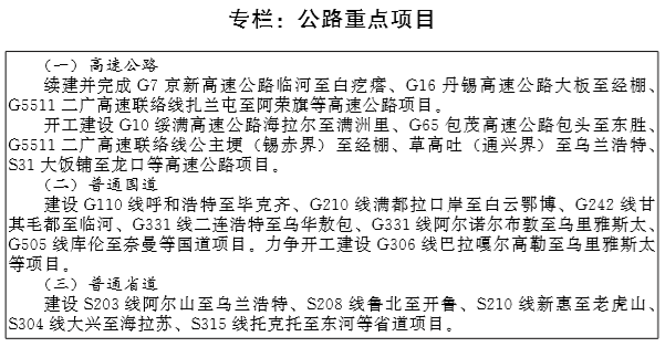 加快口岸公路建设。继续加强边境口岸公路建设,新建和升 级改造连接二连浩特、满都拉、额布都格、甘其毛都、珠恩嘎达 布其、阿日哈沙特、室韦和阿尔山等口岸的公路,使全区公路口 岸的主要连接公路全部达到二级以上标准。