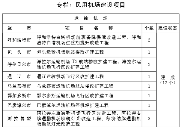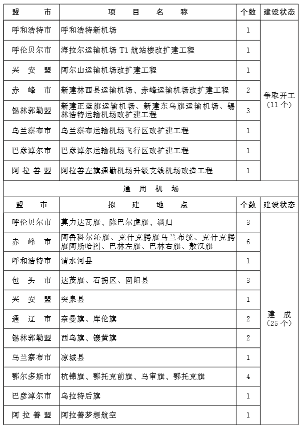 推动呼和浩特新机场项目建设。积极推进正蓝旗、林西县、 东乌珠穆沁旗3个运输机场新建工程和阿拉善左旗通勤机场升级支线机场建设项目。努力推动海拉尔、包头、通辽、锡林浩特、 乌兰察布、鄂尔多斯、巴彦淖尔、赤峰、阿尔山、乌海等机场改扩建和阿拉善右旗、额济纳旗通勤机场改造工程,完善机场基础设施,提升运输机场保障能力。加快推进通用机场布点规划与建设,“十三五”期间建成25个通用机场,初步形成以海拉尔机场为中心的东北部通用机场群、以锡林浩特和赤峰机场为中心的东南部通用机场群、以鄂尔多斯机场为中心的西南部通用机场群、 以阿拉善左旗机场为中心的西部通用机场群。