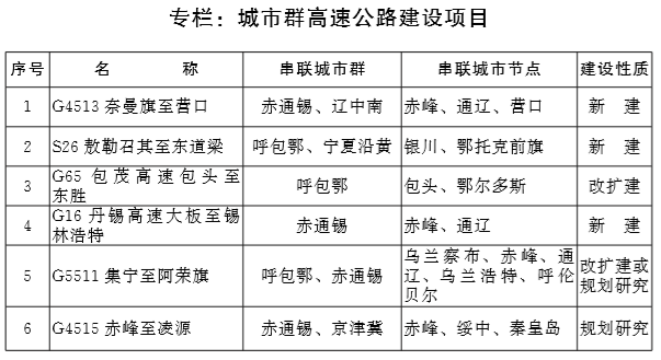 重点建设呼包鄂城市群,积极培育赤通锡新型城镇化片区, 加快与京津冀、辽中南等周边城市群的对接。构筑以快速铁路为主导、高速公路为基础的城市群骨干交通系统,推进呼和浩特至 张家口客运专线等铁路建设和前期工作,建设二广高速集宁至阿荣旗联络线等高速公路,构建城市群内外通达的骨干交通系统,实现两大城市群与周边城市群均有快速客运铁路和高速公路联系,两大城市群内各盟市间均有铁路和高速公路联系。