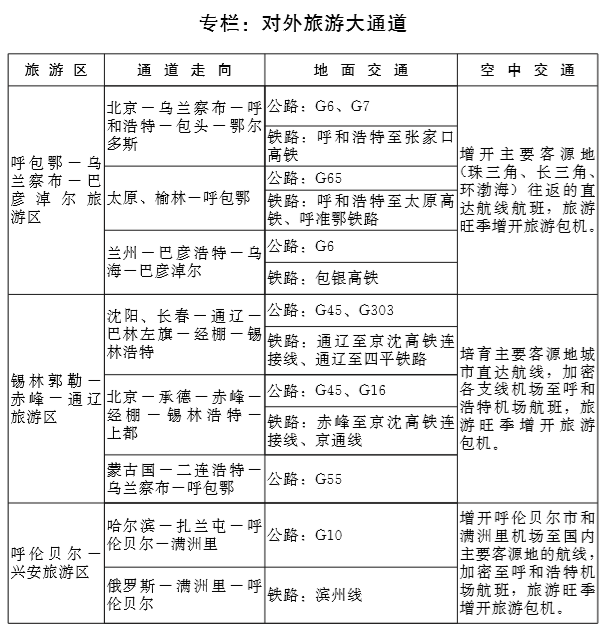 交通运输服务水平和保障能力明显提高。盟市所在地、重点公路口岸、重要出区通道通高速公路,所有公路口岸通二级以上公路,重要旅游景区通一级公路,所有具备条件的行政村 (嘎查)通沥青水泥路,60%的设区市通快速铁路,铁路口岸达到6个 (满洲里、二连浩特、策克、甘其毛都、珠恩嘎达布其、满都拉),全区旗县 (市、区)民用机场覆盖率达到80%。公铁空客运联程联运、货物多式联运有效开展。