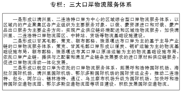推进航空口岸建设。拓展呼和浩特、海拉尔、满洲里、鄂尔多斯国际机场的国际货运业务,推动包头、二连浩特及阿尔山、 通辽、锡林浩特、乌兰察布机场升级为国际机场,积极发展国际空港物流,形成以航空口岸为依托的口岸物流服务体系。