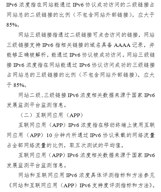 (六)稳步提升行业网站及互联网应用IPv6浓度。各省(区、市)通信管理局、部属各单位、部属各高校、基础电信企业继续深化门户网站IPv6改造,到2020年末,门户网站二级、三级链接的IPv6浓度达到85%以上。